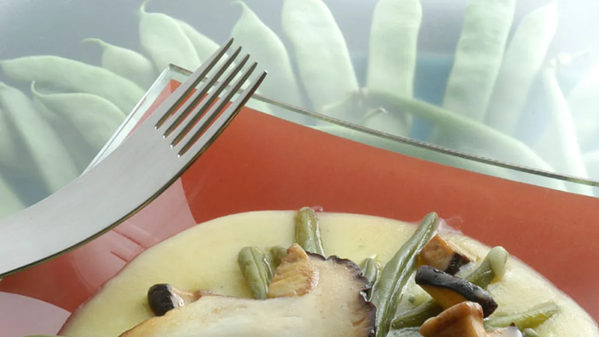 Sirve la crema ligera de patata en el fondo de una fuente amplia, coloca en el centro los hongos salteados y a los lados coloca las judías.