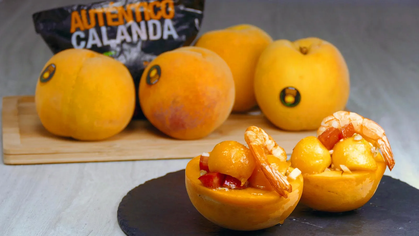 Receta de Melocotón de Calanda Denominación de Origen, rellenos de ensalada de langostinos, aguacate y una vinagreta de mermelada de melocotón. Un plato fresco para el final de verano y el comienzo del otoño.