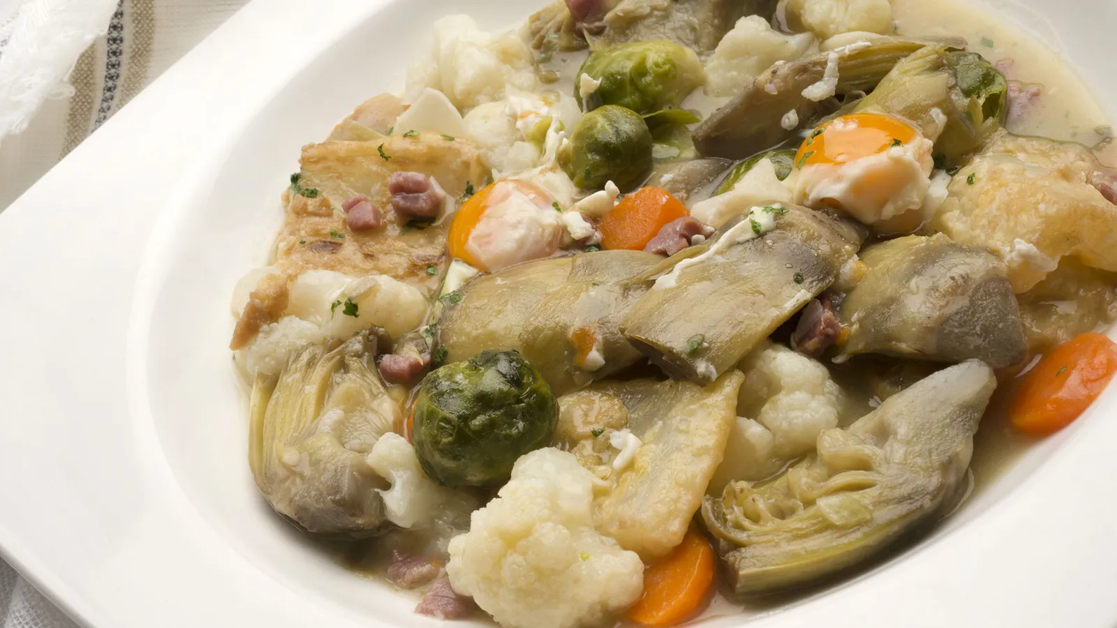 Karlos Arguiñano prepara una menestra con verduras de invierno como alcachofas, coles de Bruselas y coliflor. Completa la menestra con jamón y huevo de codorniz.