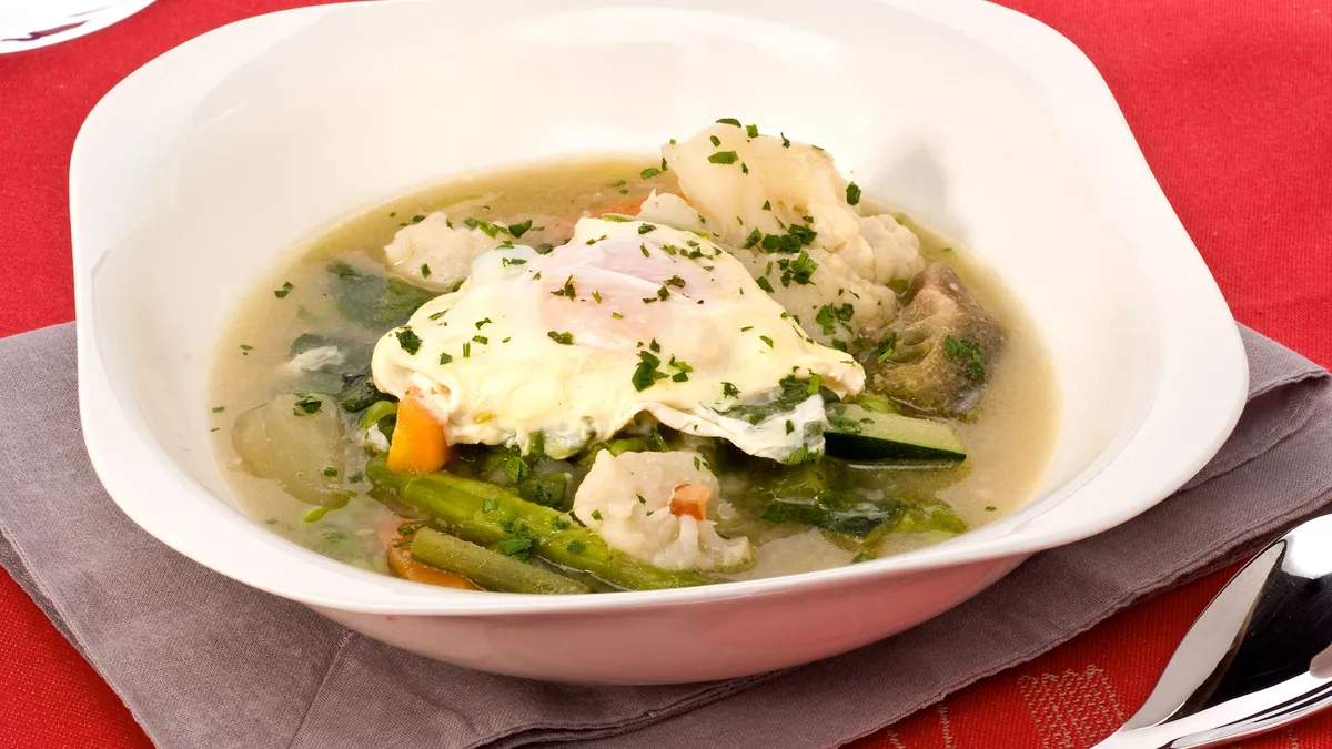 Retira las hojas externas de las alcachofas, córtalas en cuartos y ponlas en una cazuela con abundante agua y una pizca de sal. Agrega las zanahorias cortadas en bastones, las pencas de acelga y las borrajas troceadas, los espárragos, los ramilletes de coliflor y la patata cortada en rodajas. Sazona, tapa y cocina durante 20 minutos.