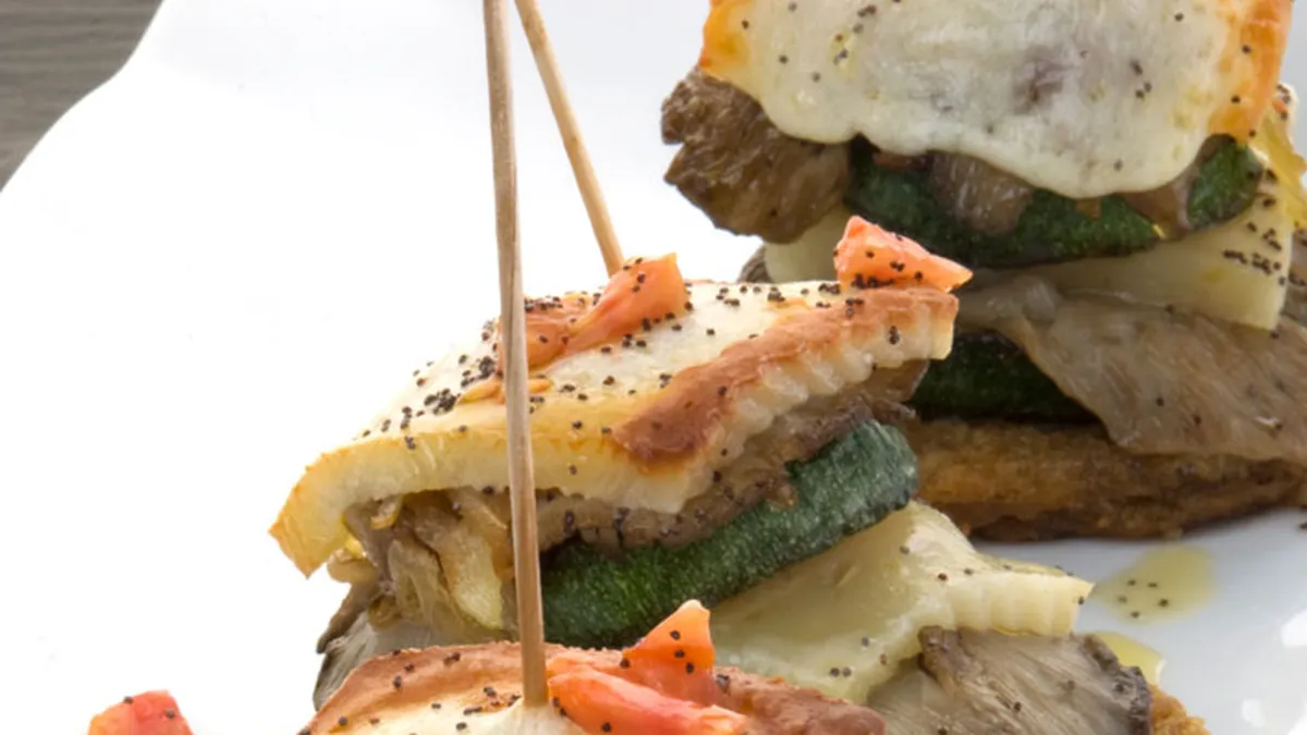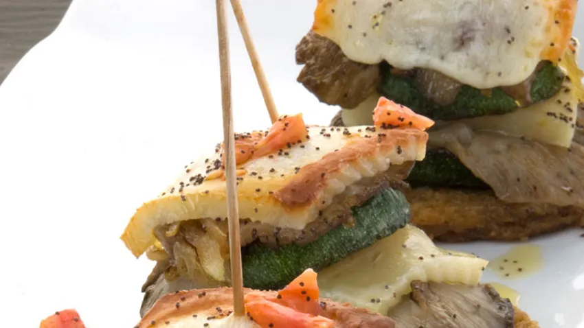 Prepara los montaditos: coloca una rebanada de pan en la base, encima 2 setas, un poco de cebolla caramelizada, media loncha de queso y otro trozo de calabacín. Encima otras 2 setas, más cebolla y termina con otra media loncha de queso.