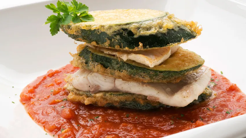 Receta de Karlos Arguiñano de montaditos de calabacín rebozado y trucha a la plancha acompañados de salsa roja de tomate.