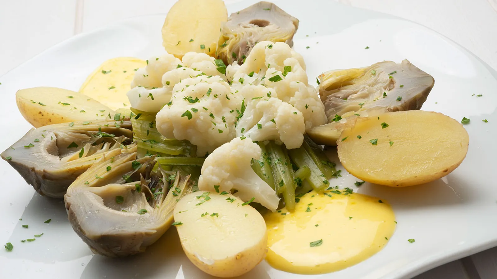 Sirve las verduras con las patatas. Sazona. Salpícalas con unos botones de mahonesa y con perejil picado.