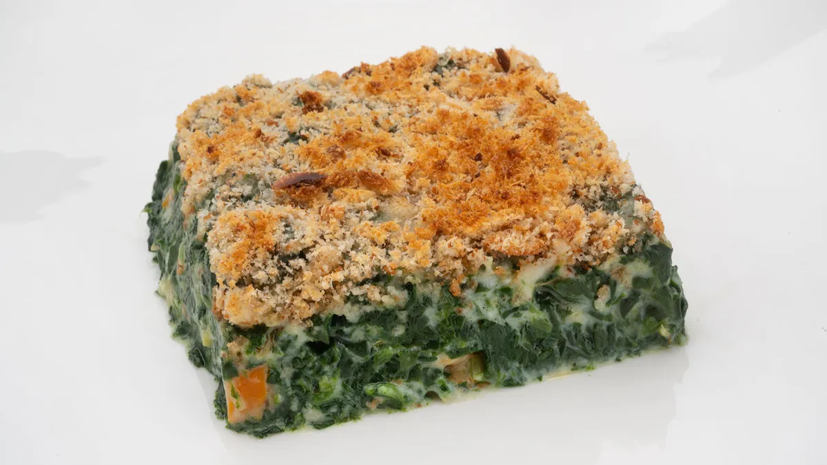 Espolvorea la superficie del pastel con la provenzal de queso. Introduce el molde en el horno y gratina hasta que se calienten las espinacas y se dore la provenzal. Corta el pastel en 6 porciones.