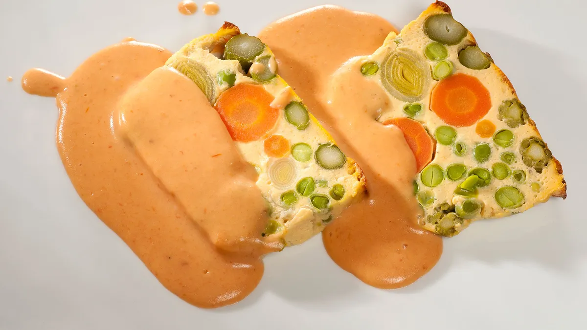 Bruno Oteiza prepara un pastel de verduras con zanahorias, puerros y espárragos verdes acompañado de bechamel de tomate.
