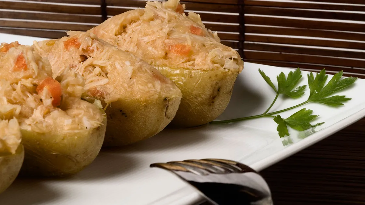 Rellena las patatas con esta mezcla. Adorna con una rama de perejil y riégalas con un poco de aceite.