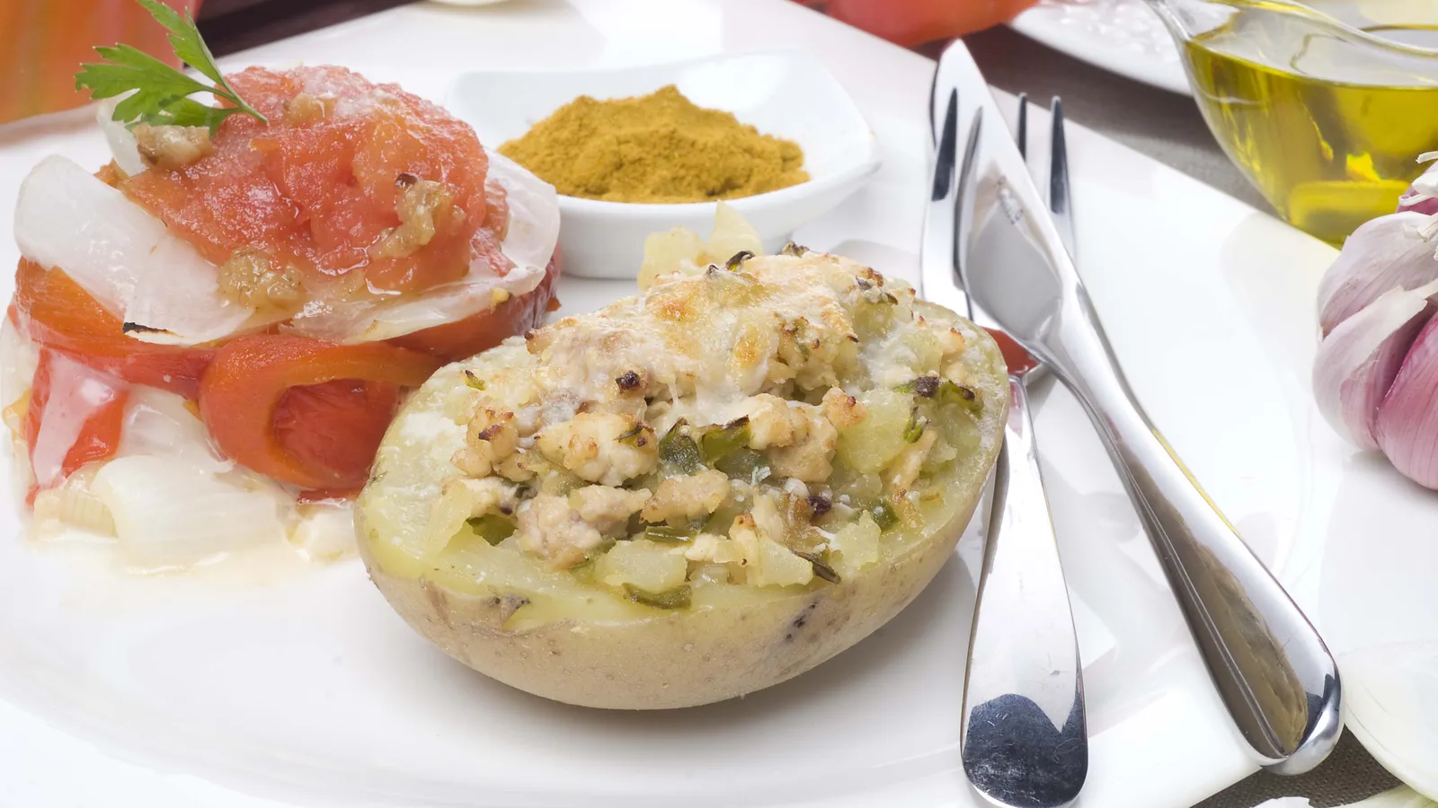 Eva Arguiñano prepara una deliciosa receta de patatas rellenas de pollo y verduras al curry acompañadas de montaditos de verduras y queso.