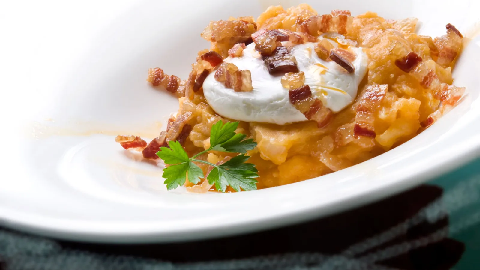 Para servir, pon en la base del plato una porción de patatas, coloca encima el huevo escalfado y adorna con el resto de panceta y de ajos fritos. Aliña con el aceite de pimentón.