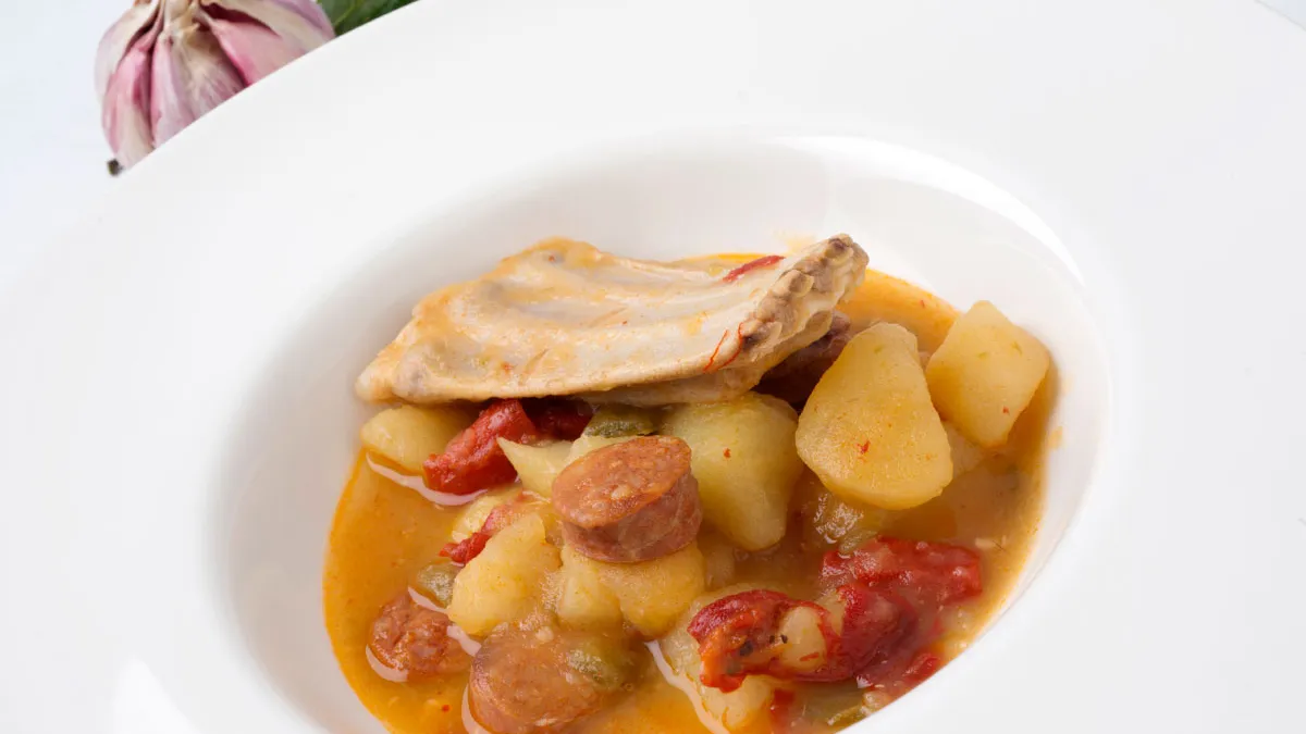 Receta de Karlos Arguiñano de patatas a la riojana, un guiso tradicional de La Rioja que se elabora con patatas, chorizo, pimentón, pimiento choricero y laurel. En esta ocasión, también se añaden costillas de cordero.