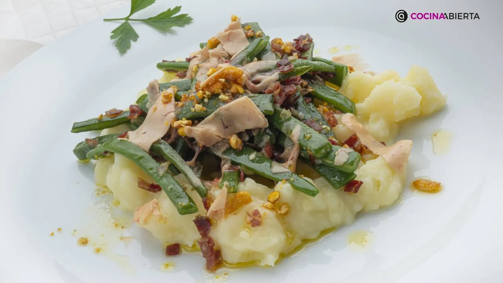 No estamos ante la clásica receta de vainas o judías verdes con patatas, más bien es una versión diferente y actualizada en el que tanto el sofrito de jamón y ajo, así como el aporte de foie gras, darán un toque especial a este moderno plato de verduras.
