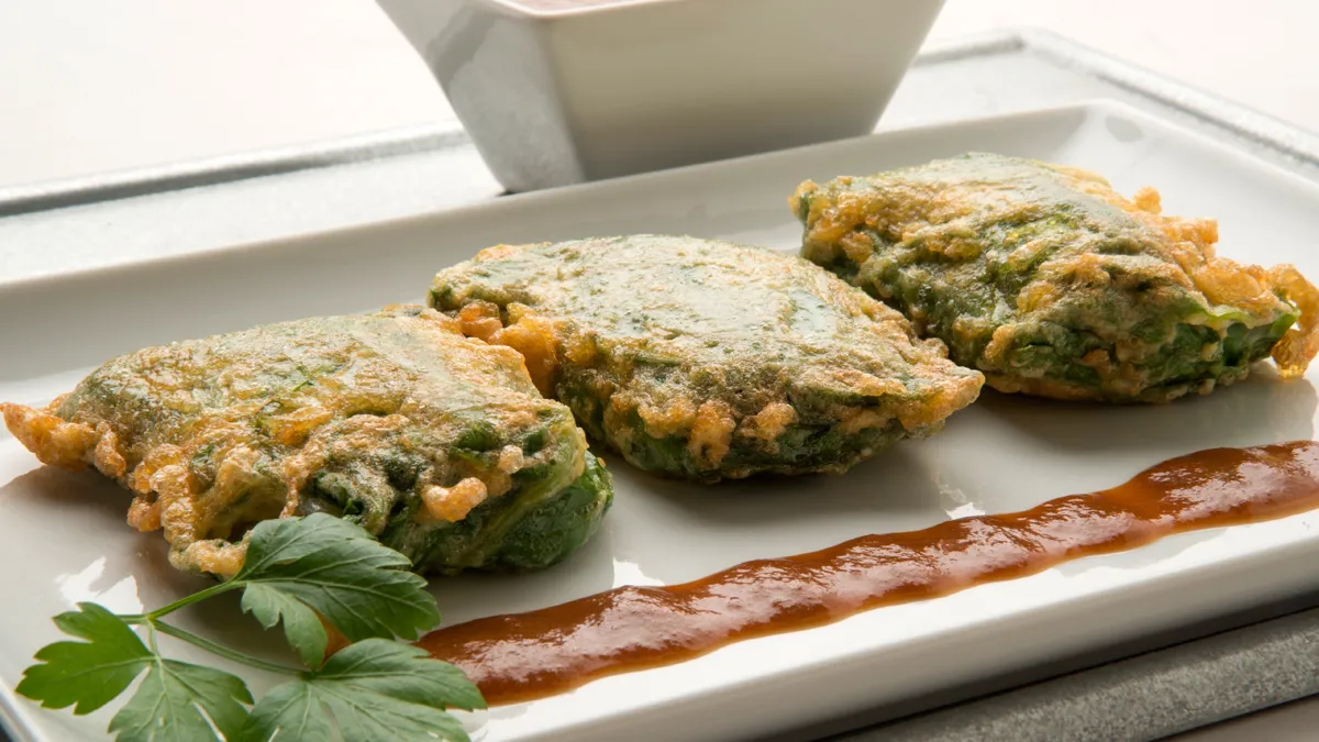 Receta de Karlos Arguiñano de pencas de acelga rebozadas rellenas de bonito, cebolleta y mahonesa casera y acompañadas de salsa de tomates secos.