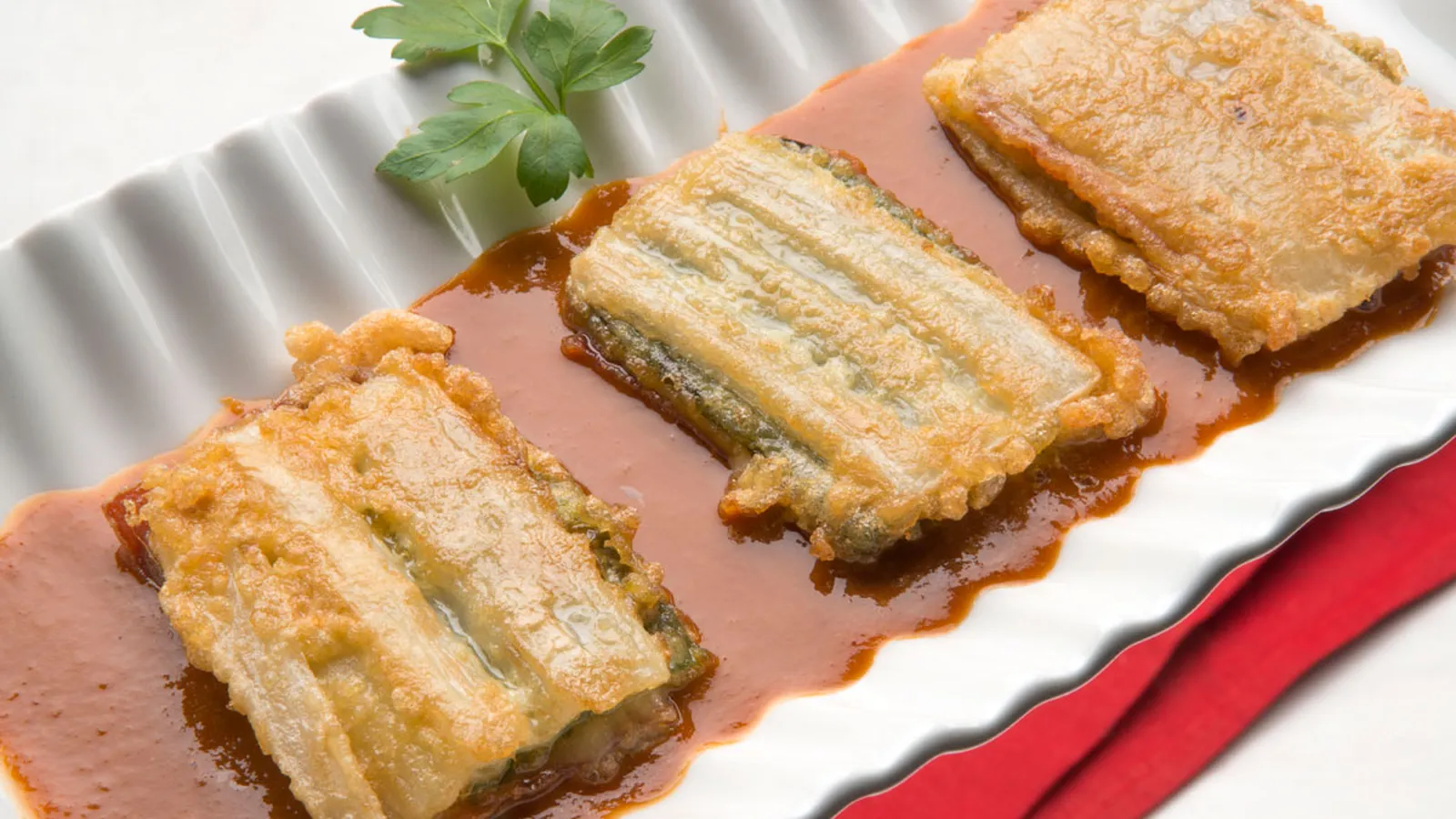 Receta de Karlos Arguiñano de pencas rellenas de queso, jamón y pimiento y acompañadas de salsa vizcaína.