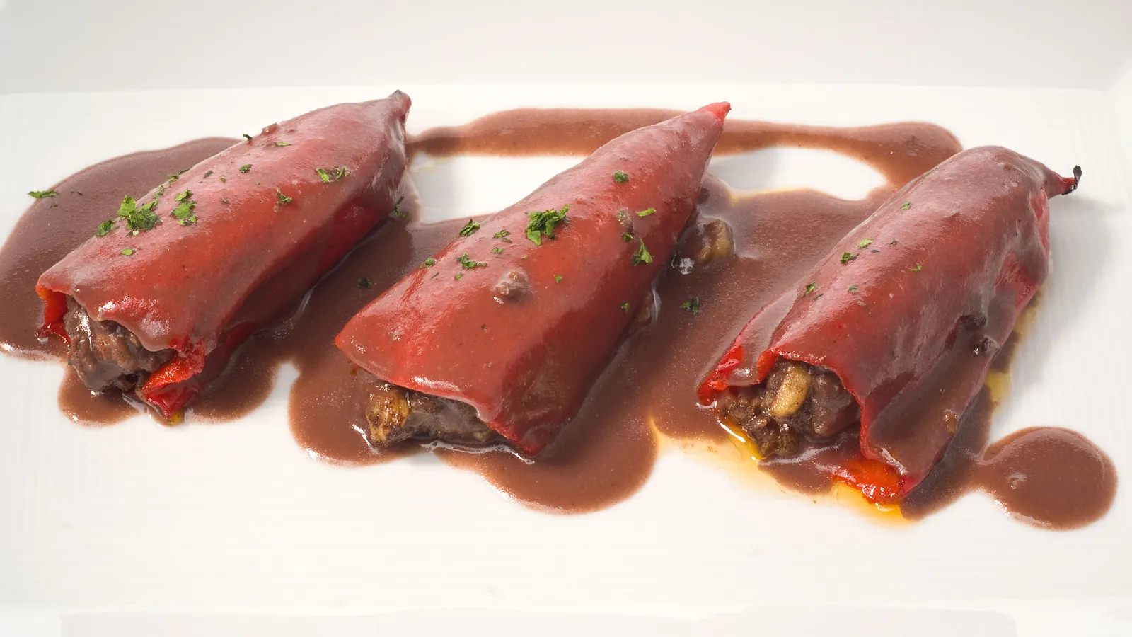 Emplata los pimientos rellenos y salsea con la salsa de morcilla. Espolvorea con perejil picado y sirve.