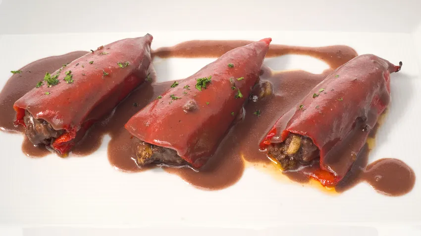 Receta de pimientos del piquillo rellenos de morcilla desmigada, manzana y pasas con su salsa de morcilla. Receta de Bruno Oteiza.