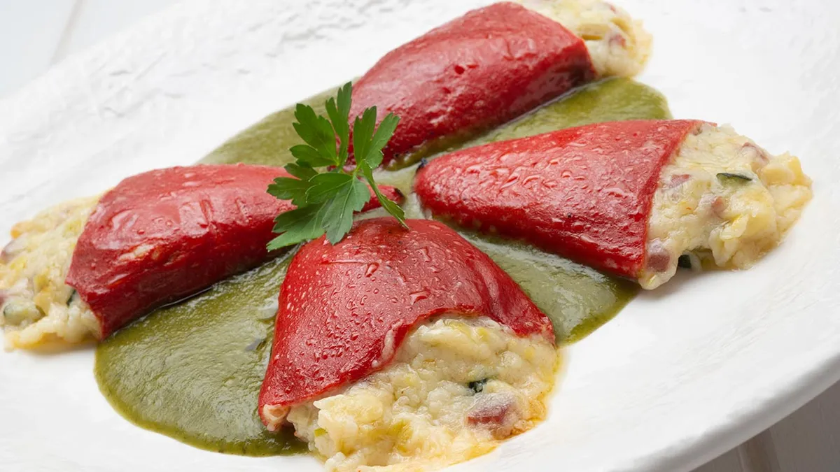 Rellena los pimientos, ponlos en un recipiente apto para el horno, rocíalos con un chorrito de aceite y hornéalos a 200º C durante 8 minutos. Pon la salsa en la base de los platos y coloca encima los pimientos. Decóralos con unas hojas de perejil.