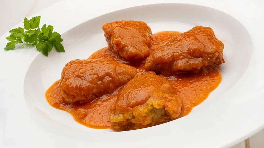 Rellena los pimientos con el relleno, pásalos por harina y huevo batido y fríelos en una sartén aceite. Ponlos en una tartera (cazuela ancha y baja) y vierte la salsa por encima. Cocina los pimientos en la salsa durante 10 minutos.