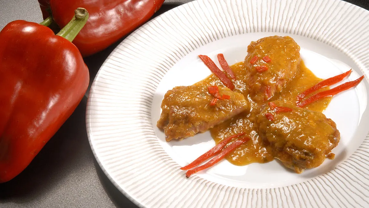 Ligera receta de Karlos Arguiñano: pimientos rebozados y rellenos de carne y queso con salsa española, una salsa típica a base de zanahoria, tomate y pimiento.