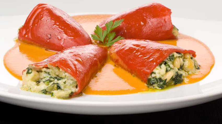 Receta de pimientos del piqueillo rellenos de una bechamel de espinacas y gambas con salsa de marisco de acompañamiento.