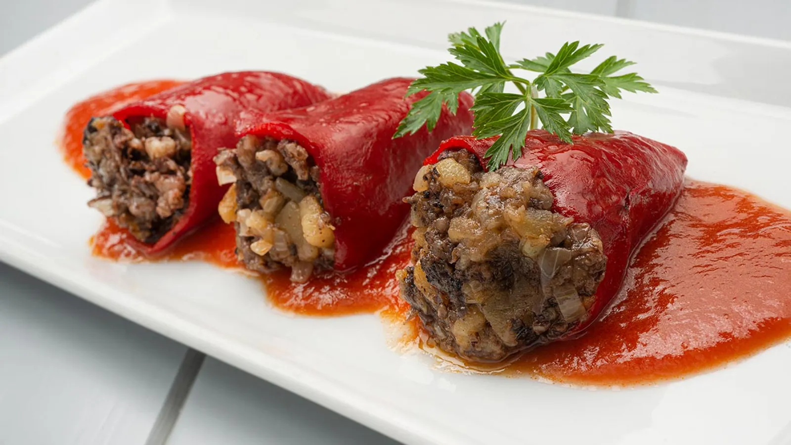 Calienta la salsa de tomate, repártela en 4 platos y pon 3 pimientos en cada uno. Decora los platos con unas hojas de perejil.