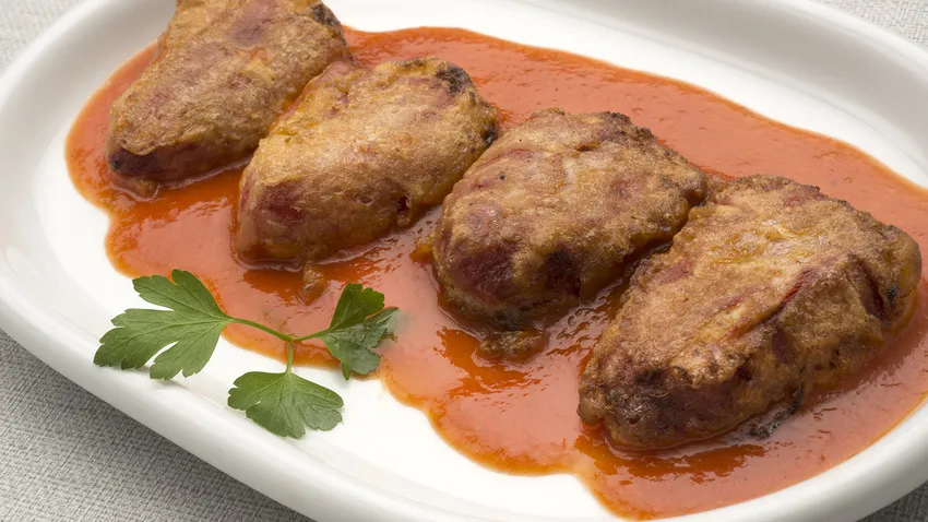 Rellena los pimientos con la farsa, pásalos por harina y huevo batido (con una pizca de sal) y fríelos por los dos lados en una sartén con aceite. Escúrrelos sobre un plato forrado con papel absorbente de cocina. Pon la salsa de tomate a calentar.