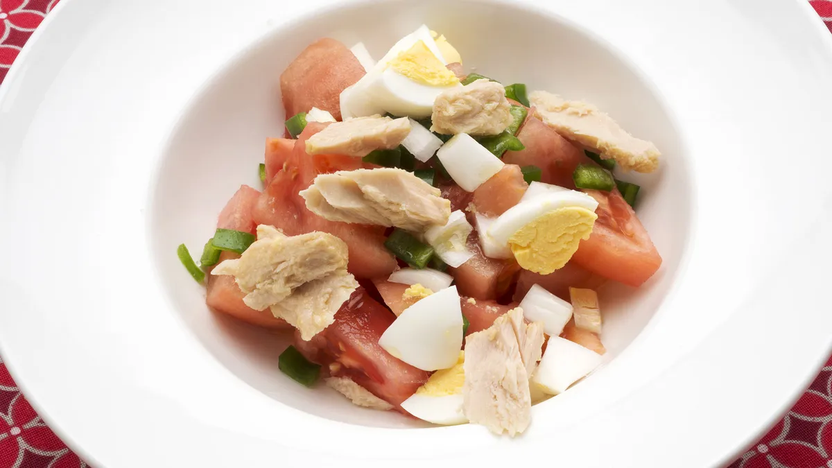 Karlos Arguiñano explica cómo preparar pipirrana de Jaén, un plato tradicional elaborado con tomate, pimiento, atún, huevo y aceite de oliva.