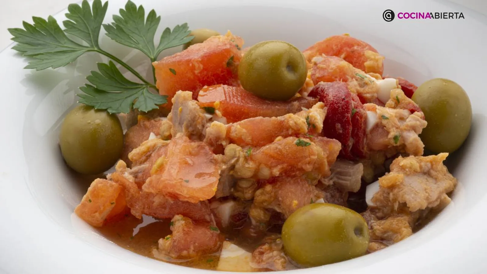 Reparte la pipirrana andaluza en 4 platos y decóralos con las aceitunas y unas hojas de perejil.