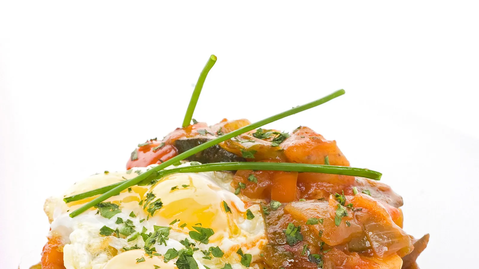 Emplata con ayuda de un cortapastas. Alterna rodajas de berenjena y calabacín con pisto. Coloca por último los huevos y un poco más de pisto. Desmolda, decora con cebollino y sirve.
