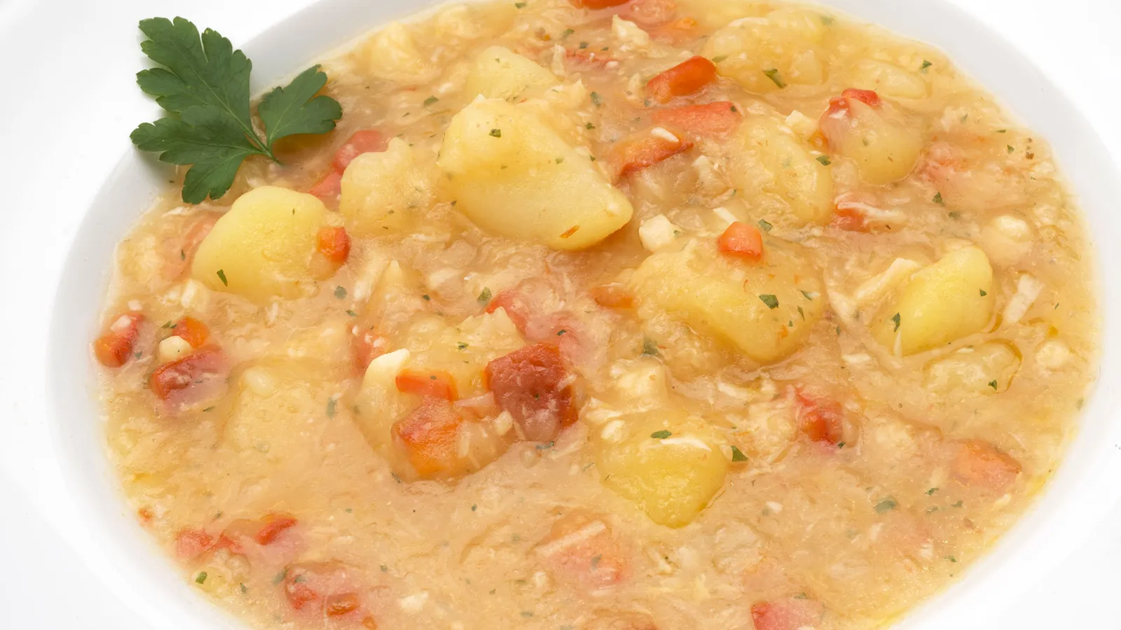 Sirve el pote de patatas y bacalao y adorna con unas hojas de perejil.