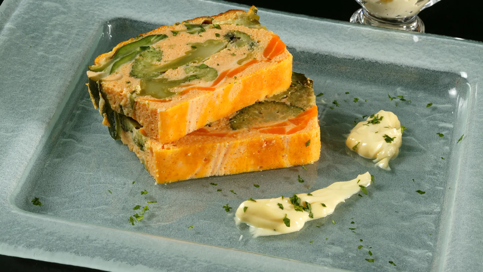 Coloca una capa del puré sobre el molde, corta las otras 2 zanahorias en tiras, colócalas sobre el molde, vierte otro poco de puré, pon los ramilletes de brocoli, otro poco de puré, cubre con las lonchas de calabacín y vierte el resto de puré. Introduce en el horno a baño María a 160ºC durante 45 minutos. Deja templar y desmolda. Acompaña con un poco de mahonesa y espolvorea con un poco de perejil picado.