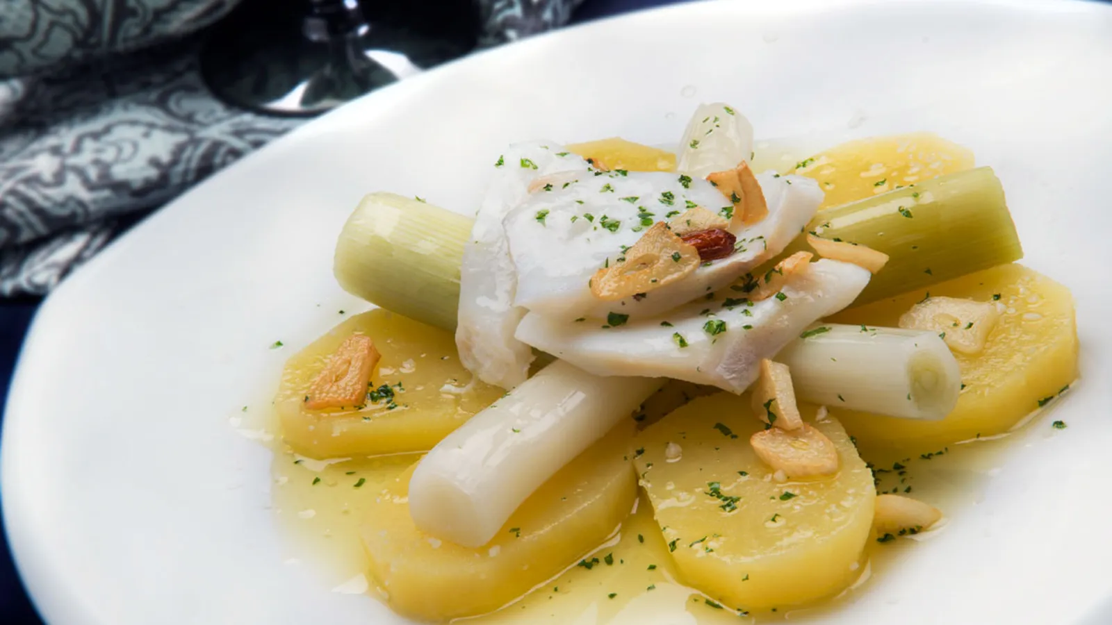 Puerros con patatas y bacalao confitado