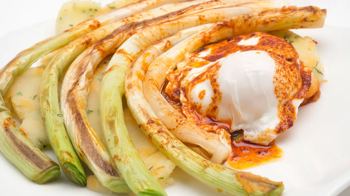 Karlos Arguiñano propone un plato de puerros a la plancha acompañados de puré de patata, huevo escalfado y aceite de pimentón.