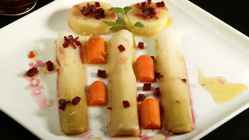 Estupenda receta de puerros con vinagreta de remolacha elaborada por Karlos Arguiñano. Un plato completo e ideal para las dietas veganas, vegetarianas, contra el colesterol...