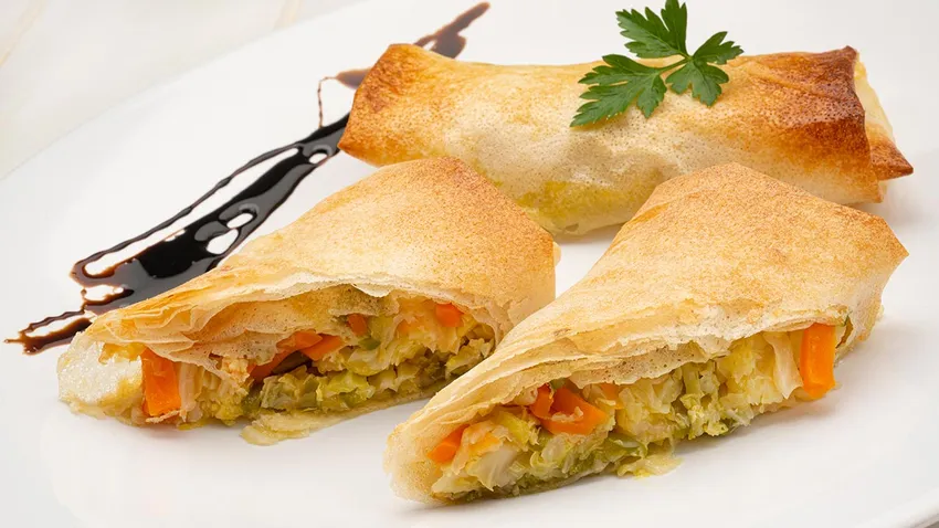 Extiende las hojas de pasta brick, coloca 2 cucharadas de verduras en el centro de cada una. Ciérralas como si fueran rollitos de primavera. Extiéndelos sobre una bandeja de horno cubierta con papel de hornear y hornéalos a 200º C durante 12-15 minutos.