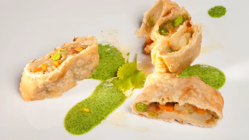 Bruno Oteiza prepara samosas, unas empanadillas típicas de la India rellenas de patata, guisantes, cebolla, zanahoria y especias. Para acompañar, una salsa chutney verde elaborada con yogur, hierbabuena, cilantro y cebollino.