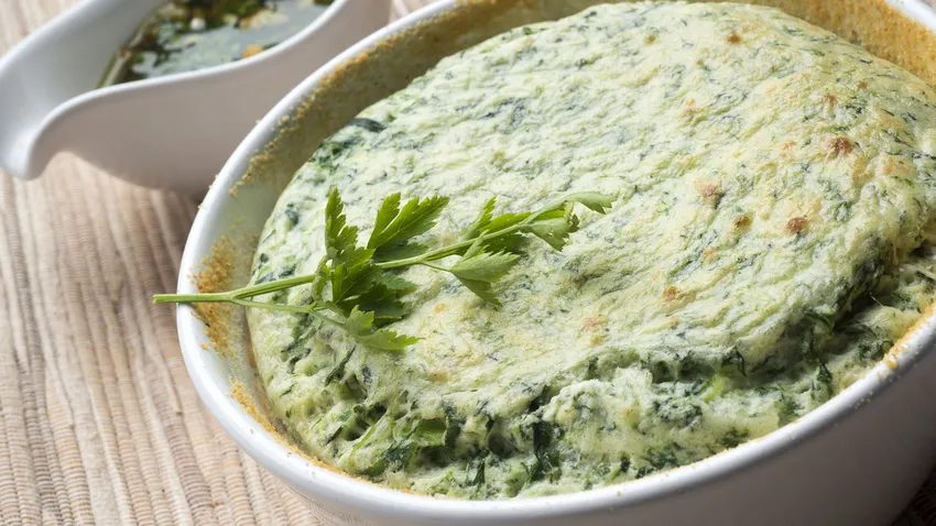 Soufflé de queso y espinacas con salsa de nueces