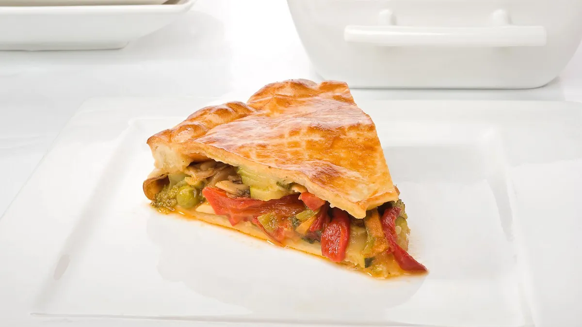 Receta de tarta de verduras de Enrique Fleischmann, una tarta rica y salada con calabacín, pimientos, brócoli, zanahorias, espinacas, champiñones y guisantes.