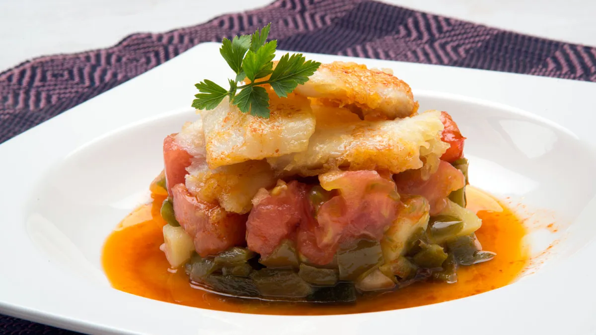 Receta de Karlos Arguiñano de timbal de verduras y bacalao, un plato con dados de tomate, pimiento y patata acompañados de bacalao en tempura y aliñados con vinagreta.
