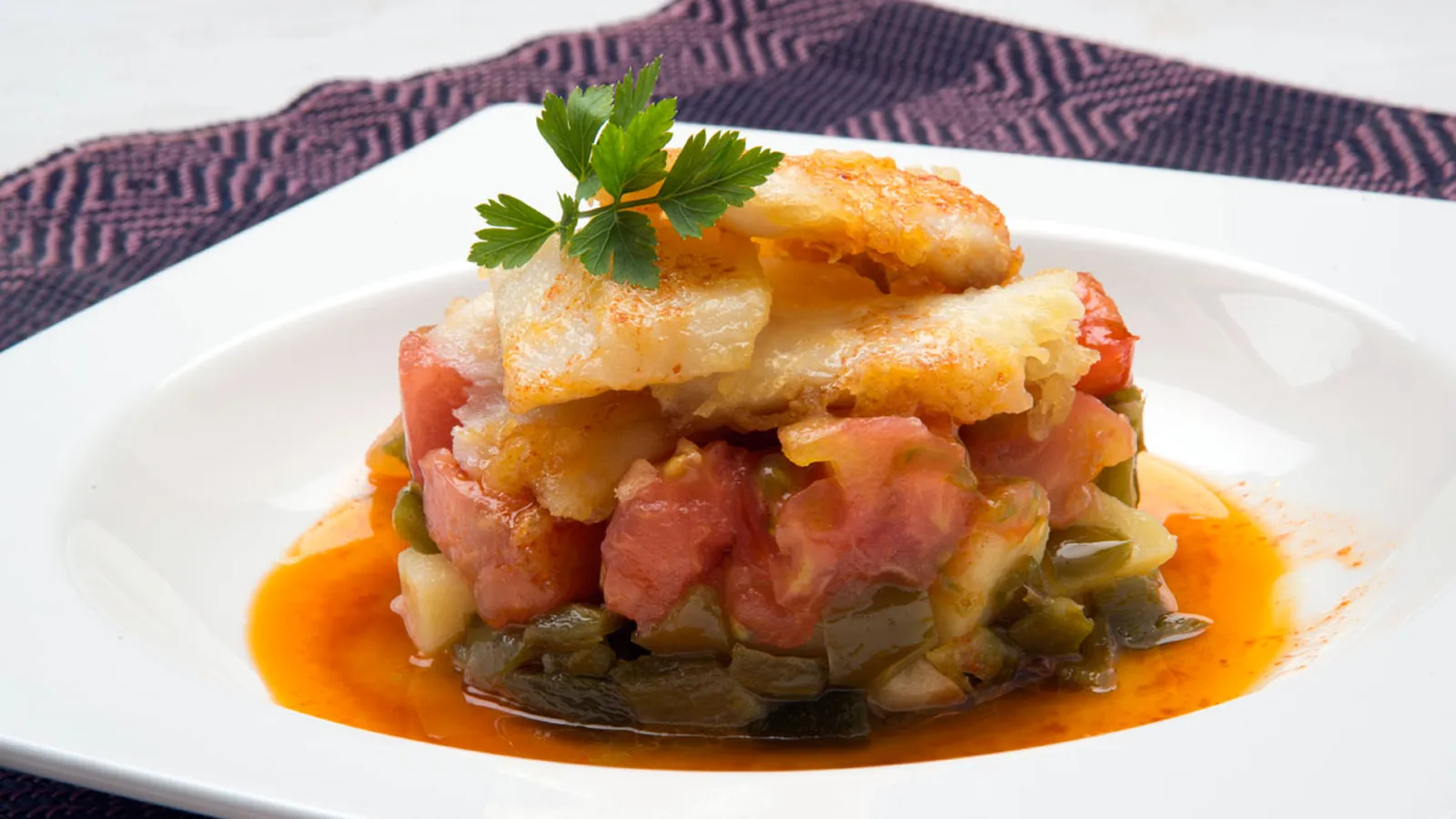 Para montar el timbal ayúdate de un cortapastas. Mezcla los dados de patata con los pimientos y colócalos en la base, pon encima los dados de tomate y finaliza con las lascas de bacalao. Aliña con la vinagreta y espolvorea con perejil picado.