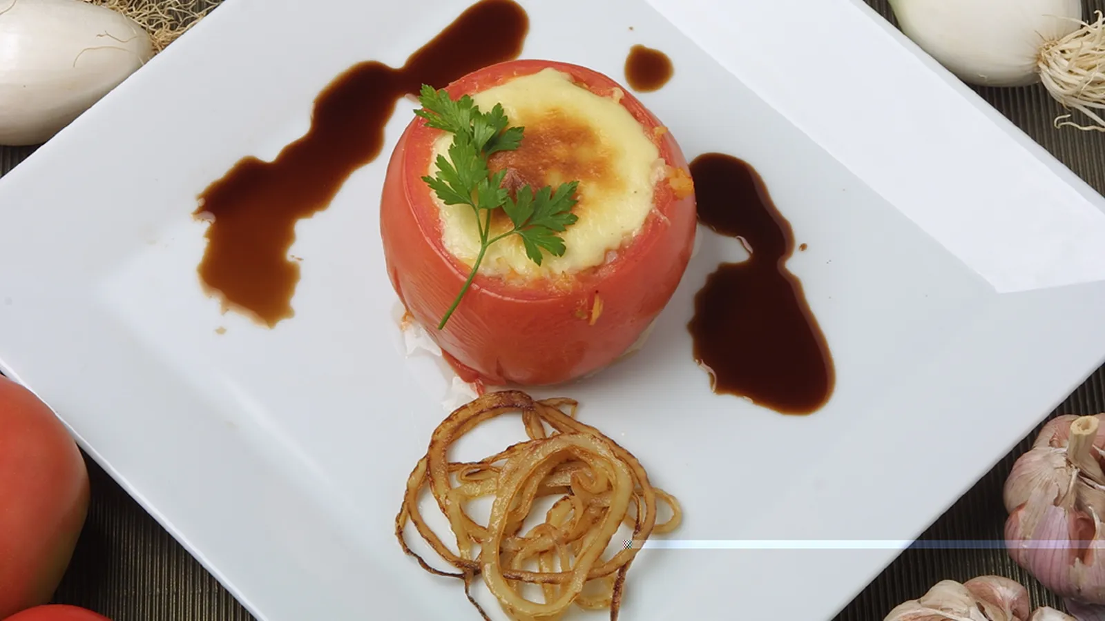 Rellena los tomates con la farsa, cúbrelos con la bechamel e introduce en el horno a 200ºc durante 20 minutos Corta la cebolla en aros, pasa por harina y fríelos Sirve los tomates con los aros de cebolla.
