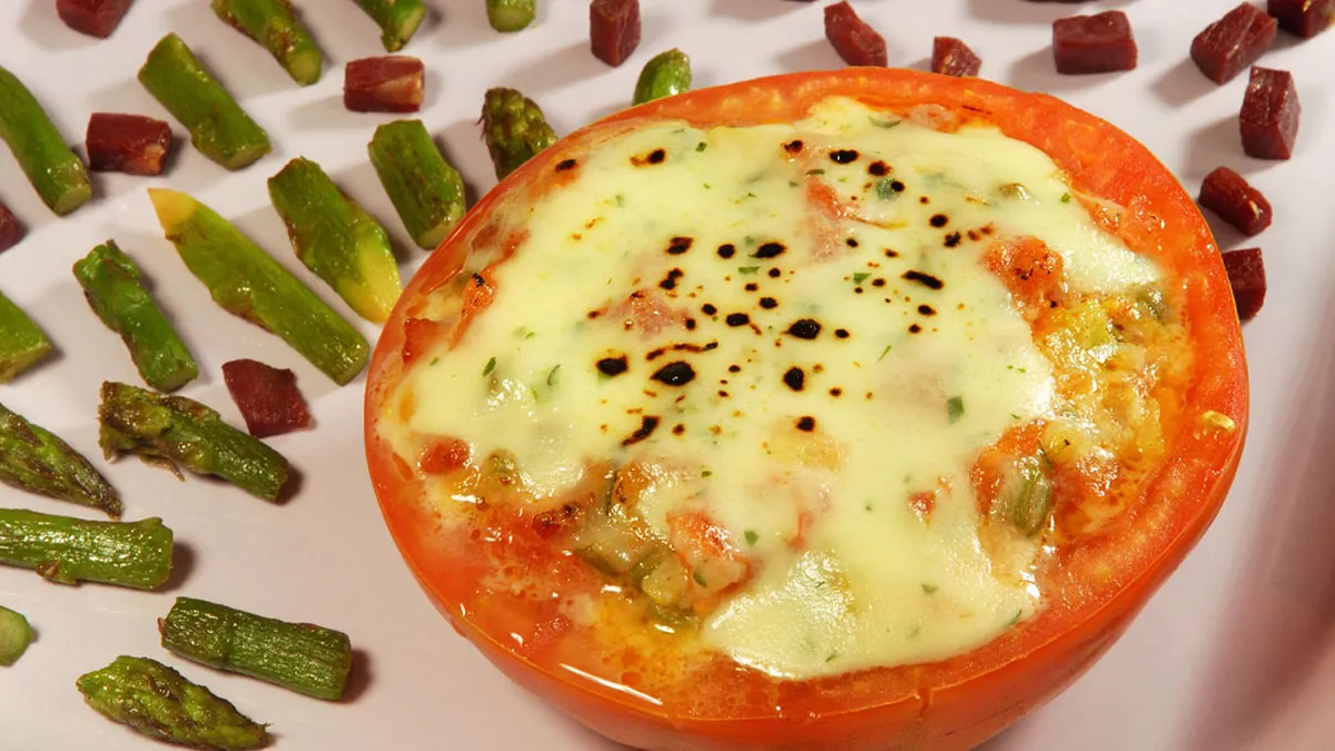 Karlos Arguiñano prepara una deliciosa receta de tomates rellenos de verdura y queso tierno cocinados en el horno y acompañados de un salteado de espárragos y cecina.