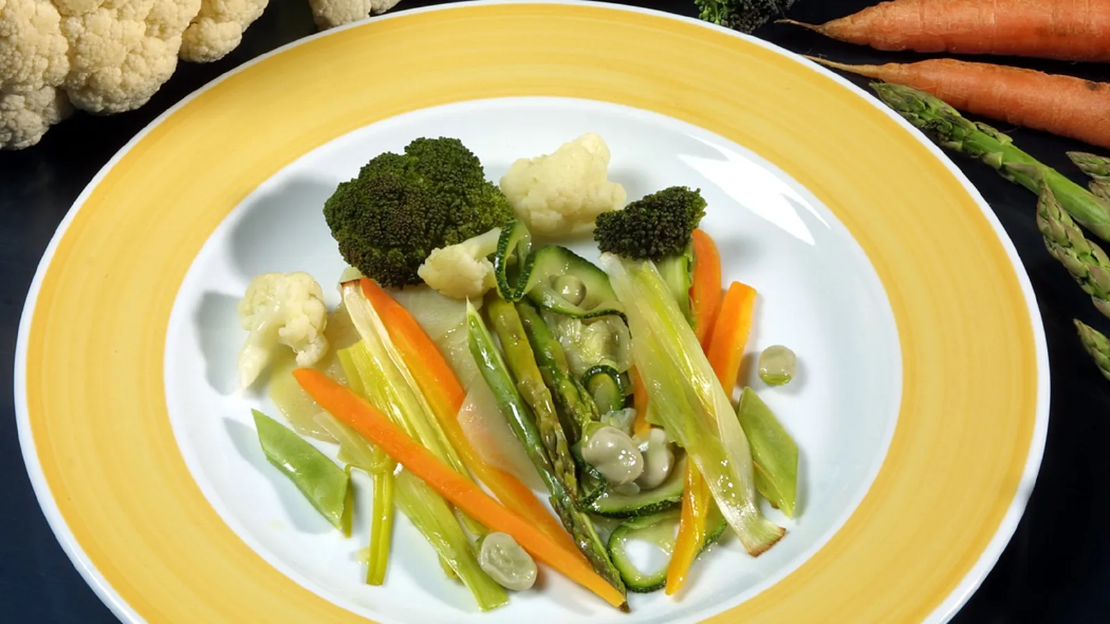 Pela las patatas y limpia el calabacín. Córtalos en rodajas finas. Limpia el resto de las verduras, corta las zanahorias en bastones, los puerros en tiras, las judías en rombos, el brócoli y la coliflor en ramilletes. Pela las habas y déjalas enteras. Retira la parte baja del tallo de los espárragos.