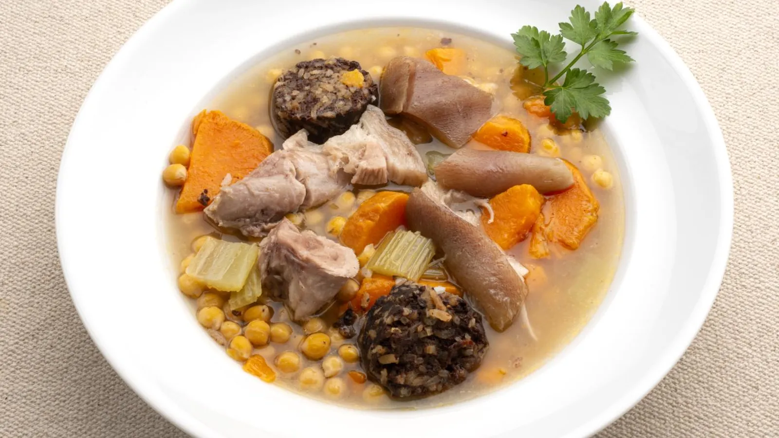 Esta receta, originaria de Cartagena, Murcia, la envía una telespectadora de 95 años. Su preparación es sencilla, pero, como todo buen guiso, requiere paciencia y una cocción a fuego lento para que los sabores se integren a la perfección. Además de garbanzos, incluye apio, boniato, arroz y morcilla.