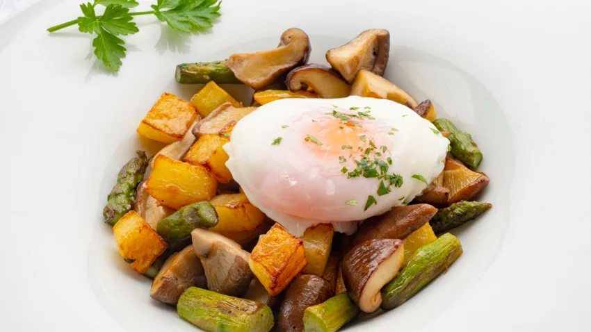 Consejos de Karlos Arguiñano para hacer huevo escalfado con setas, espárragos verdes y patatas