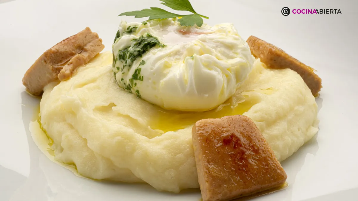 Receta de huevo flor con puré de patata y mousse de pato paso a paso