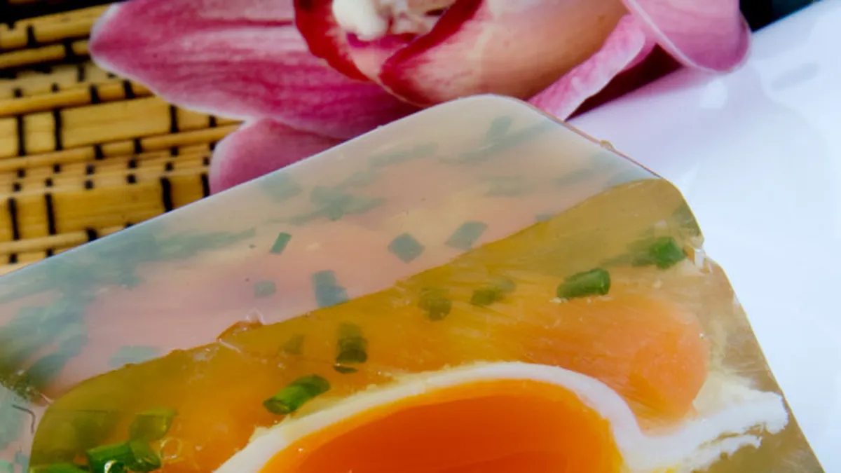Receta de huevos escalfados con jamón cocido y salmón en gelatina de caldo de pollo. Plato elaborado por Karlos Arguiñano