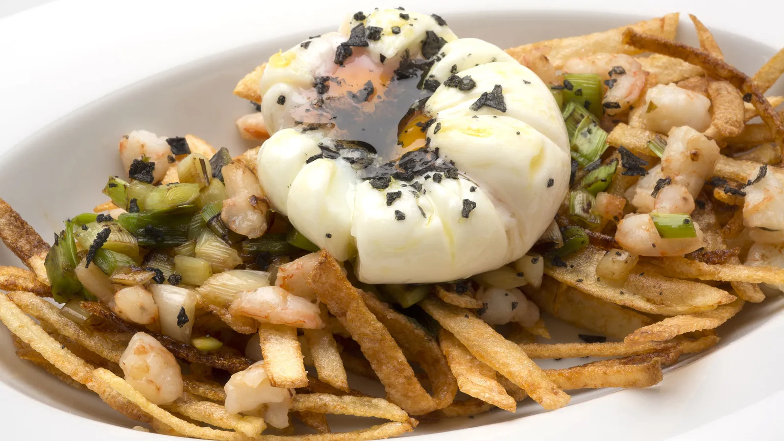 Huevos, gambas, ajos frescos y patatas paja