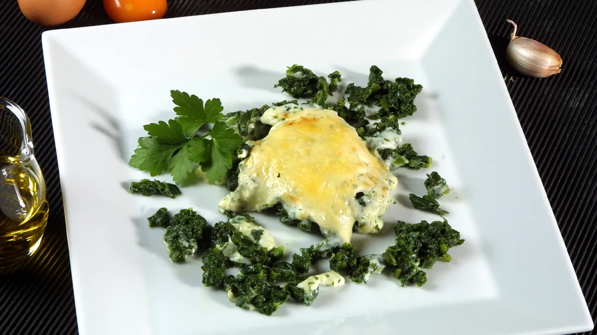 Receta de huevos pochados al estilo florentina con bechamel gratinada y espinacas cocidas.