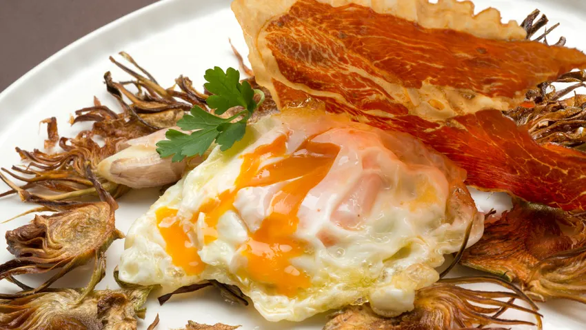 Receta de Karlos Arguiñano de huevos rotos con crujiente de jamón acompañados de unas originales chips de alcachofa.