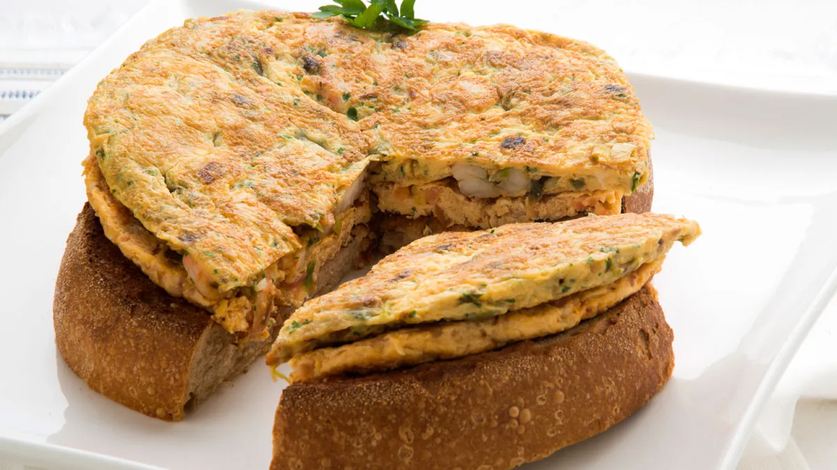 Receta de Karlos Arguiñano de montadito de tortilla de tomate y tortilla de ajos frescos y gambas sobre una rebanada de pan de hogaza untado con ajo y tomate, ideal para servir como pintxo o tapa.