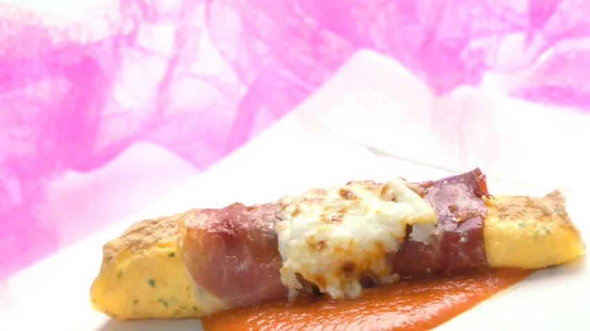 Rollitos de tortilla de huevos rellenas de queso y jamón serrano. Acompaña las tortillas con una salsa de pimientos del piquillo.
